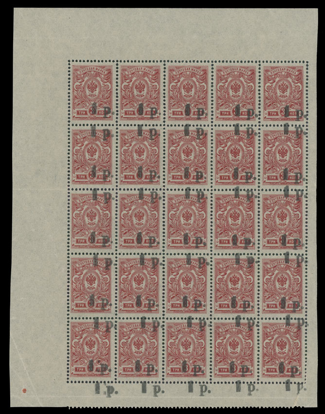 1918-20, black surcharge 1r on perforated 3k red, complete pane of 25, stamps of the top row has single surcharge, while stamps from other four rows have double surcharge, minor marginal creases, still full OG, NH, VF, C.v. $1,000 as hinged singles, Est. $500-$600, Scott #24b