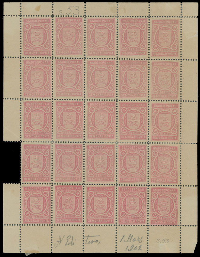 1902, The First issue, 2k light rose, pane of 25 on white paper, missing part of margin at left and perf reinforcement, some separation between stamps and margin, full OG, at least 15 stamps are NH, F/VF and rare multiple, C.v. $3,750, Est. $1,500- $1,800, Schmidt #53