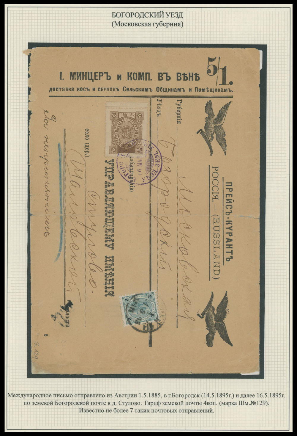 1895 (May 16), Incoming Price List for scythes and sickles, sent by mail from Vienna, franked by Franz Josef 3k light blue with black numerals, upon arrival to zemstvo uprated with Due stamp of 4k light brown, cancelled with zemstvo ”16.MAY.95” postmark, reinforced folds and corners, fine and rare item arranged on page from the Gorski Collection, Est. $1,000-$1,500, Schmidt #129