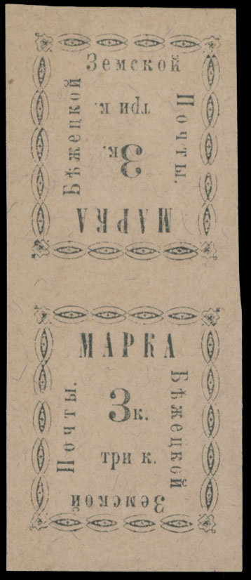 1893, 3k black printed on buff granite paper, vertical tete-beche pair, full OG, top stamp is hinged, bottom – NH, VF, C.v. $1,000, Est. $400-$500 , Schmidt #10S