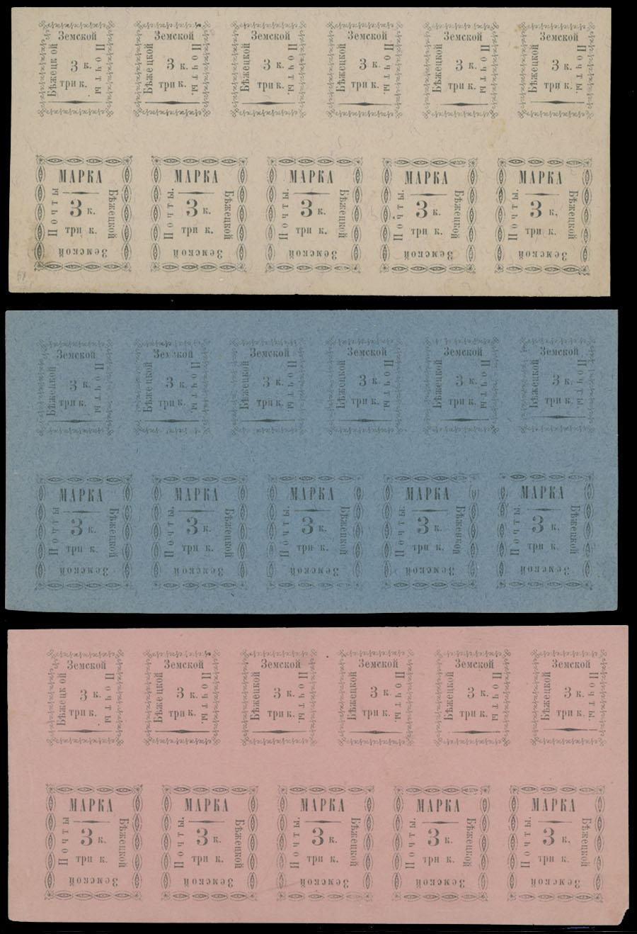 1893, 3k black on gray granite, blue granite and rose paper, three block of 11 (6 – small design at top and 5 – large design at bottom), different types, full OG, rose block with violet ink soiling on reverse, mostly NH, VF, C.v. $660, Est. $200-$250, Schmidt #14, 16-17; 18, 20-21