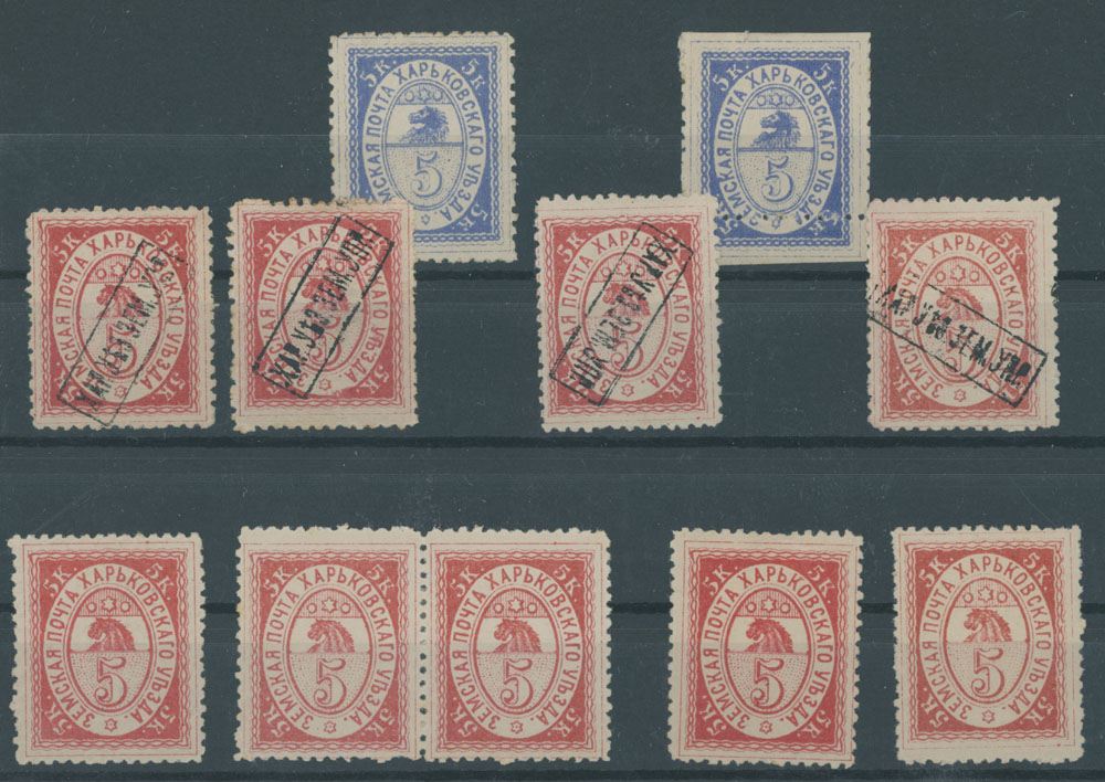 1885-86, Horse Head in Oval, two singles 5k ultra, one imperforate horizontally with perf across the design and a spot over ”k” in ”Zemskaya” variety, four 5k rose red with handstamp in different directions and five 5k rose red without handstamp, including horizontal pair, full/large part of OG, F/VF, ex-Mehrtens, Liphschutz, C.v. $660, Est. $300-$350, Schmidt #16D, 17, k