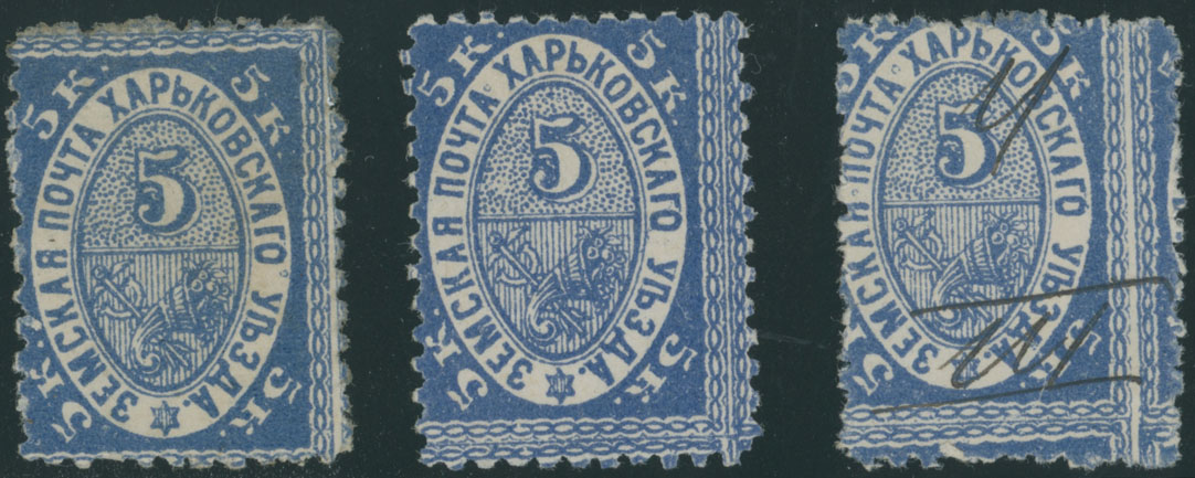1891, Cornucopia in Oval, two stamps of 5k deep ultra and deep violet blue, in addition a pen cancelled single with misplaced perforation, large part of OG or used, VF, C.v. $380, Est. $200-$250 , Schmidt #25