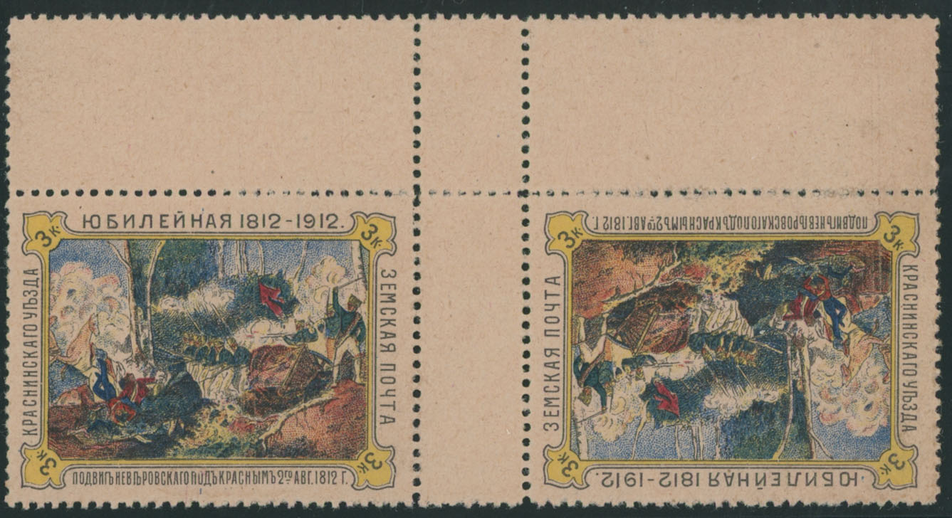 1812, 3k multicolored, corners in yellow, ”T” shaped horizontal tete-beche pair printed on light rose paper, large part of original dry gum, VF, C.v. $600, Est. $300-$400 , Schmidt #10S