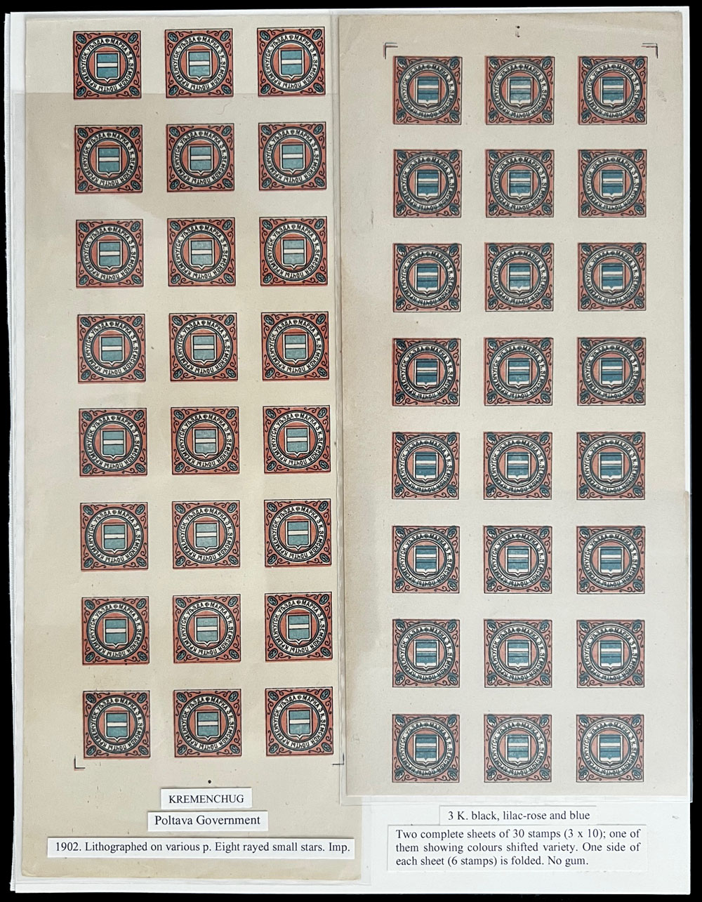 1902, Arms in Circle, 3k black, rose and blue, two complete sheets of 30 (3×10), one has strong blue color shift, both with broken circles on positions 22 and 28, each one folded once to fit an album sheet, no gum as issued, F/VF and an interesting couple, C.v. $1,260++, Est. $1,000-$1,200, Schmidt #25 I, var