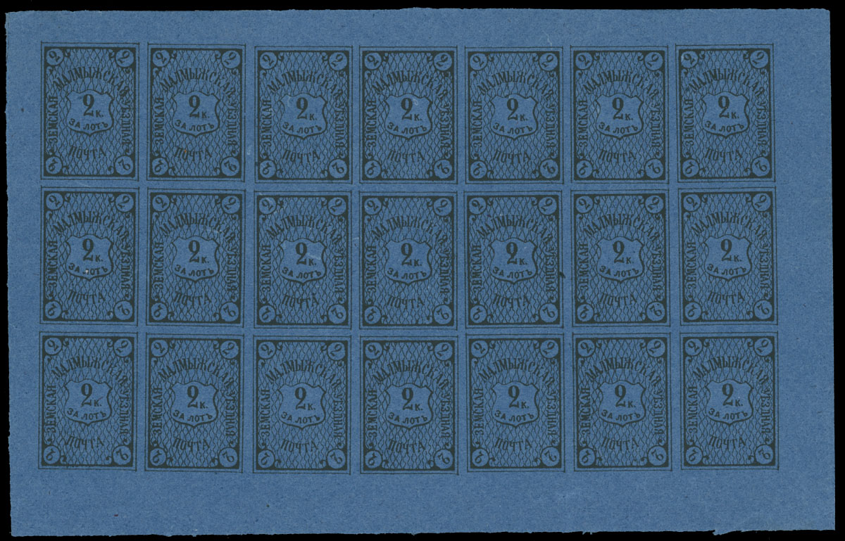 1887, 2k black on dark blue paper, complete sheet of 21 (7×3), no gum as issued, VF and rare in complete sheet, C.v. $630 as singles, Est. $400-$500 , Schmidt #8
