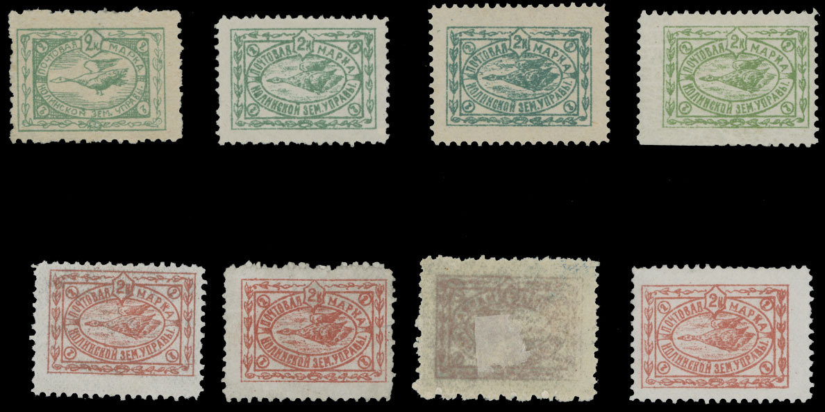1910-15, Swan, 2k green and 2k red, four of each, including ”bird with legs”, three shades for green and three shades for red colors, full/part of OG, F/VF, C.v. $580, Est. $400-$450 , Schmidt #10/14, 15‑16, A