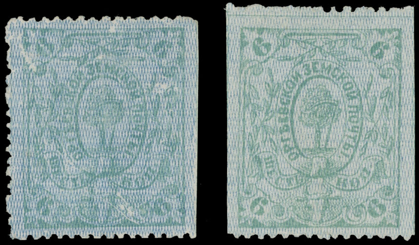 1873, 6k green with vertical blue network, two distinctly different shades of green, unused, no gum or large part of OG (minor gum scratch from hinge removal), F/VF, C.v. $400, Est. $150-$200 , Schmidt #4, var