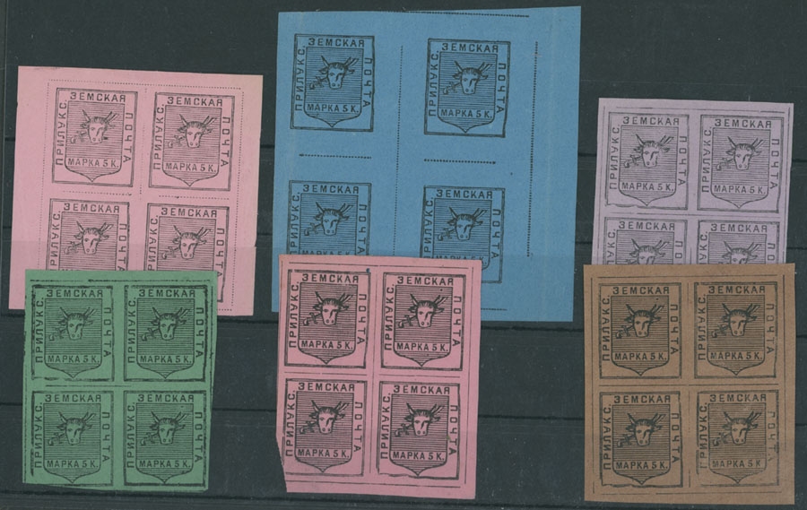 1887-91, 5k black on colored paper, set of six in blocks four, paper colors – rose, blue, gray lilac, green, carmine rose (clipped lower left corner) and brown, full OG, NH or hinged, F/VF, C.v. $1,440++, Est. $800-$1,000, Schmidt #3-8