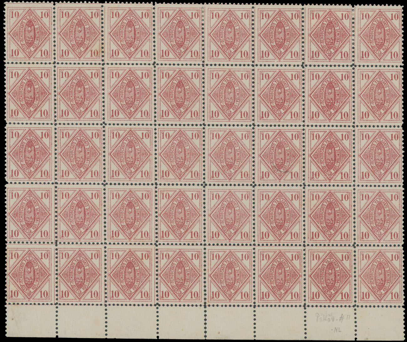 1891, Arms inside Ovals in Rhombus, 10k red, bottom sheet margin block of 40 (8×5), some separations, full OG with many NH stamps, VF, C.v. $800++, Est. $400-$500 , Schmidt #12