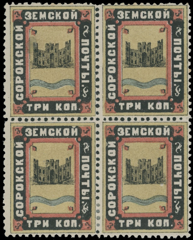 1878, Arms in Rectangle, 3k black, yellow, deep orange and gray blue, block of four, full OG, previously hinged, VF and scarce multiple, C.v. $600++, Est.$300- $400 , Schmidt #2