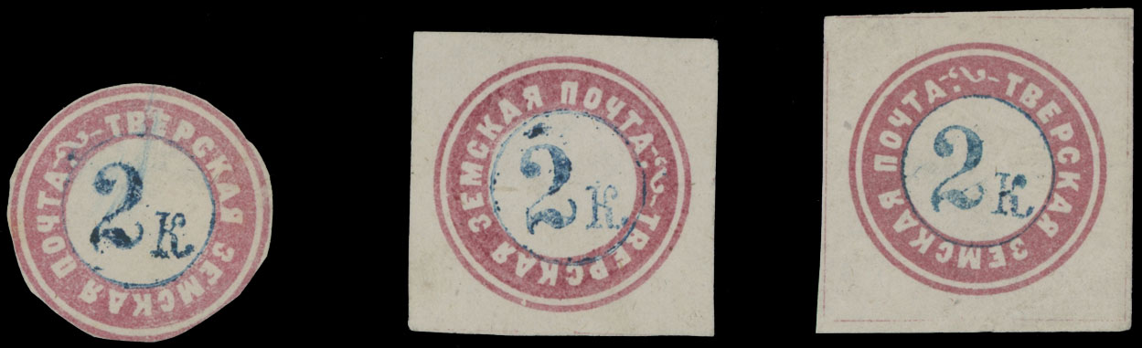 1871, Handstamped value 2k in light blue or greenish blue inside litho printed circles in rose, three stamps, one is cut to shape, one with a dot after ”k”, large part of OG (1)or unused, no gum, F/VF, C.v. $600, Est. $300-$350 , Schmidt #3
