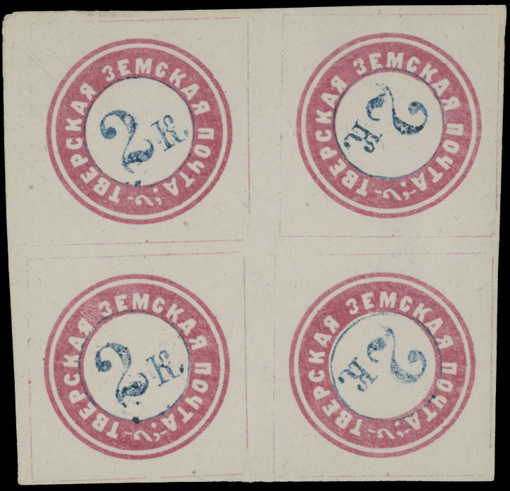 1871, Handstamped value 2k in light blue or greenish blue inside litho printed circles in rose, block of four containing two horizontal tete-beche or couche pairs, full OG, NH (1) or LH, VF and rare multiple, the only other block recorded, ex-Kuznetsov, Est. $2,000-$3,000, Schmidt #3 var