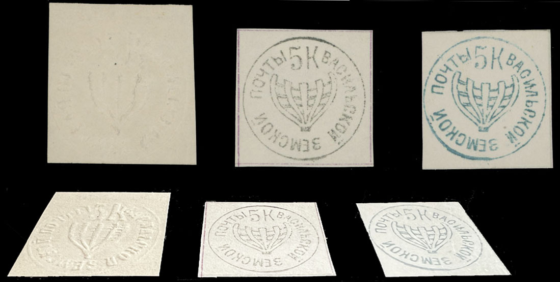 1871-78, Colorless Embossing of 5k on white paper, plus black and blue handstamps of 5k with divided lines by pen or pencil, three stamps, no gum as issued, mostly VF, ex-Faberge and Bianchi, C.v. $800, Est. $400-$500 , Schmidt #1, 3, 5