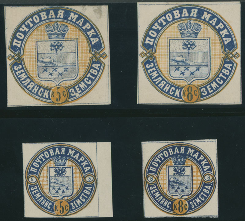 1874-80, Coat of Arms inside Double Circle, 5k and 8k blue and yellow orange, two complete sets of two values, first one with usual mostly marginal thins, full/large part of OG, the second set apparently NH, F/VF, C.v. $1,800, Est. $800-$900, Schmidt #1-2, 3-4