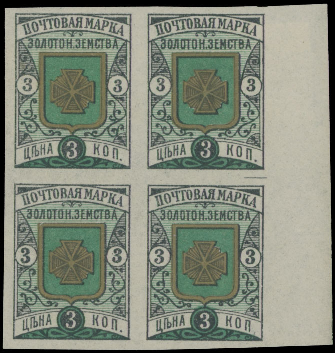1896, 3k black, bluish green and gold, right sheet margin imperforate block of four, types 1-2/3-4, full OG, NH (bottom stamps) or LH, VF and rare multiple, ex- Liphschutz, C.v. $2,000, Est. $1,000-$1,200 , Schmidt #13JK
