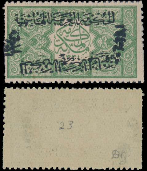 1921, double (one inverted) black overprint on ½pi green, position 23, roulette 13, full original dry gum as always exists, NH, VF, expertized by D. Graham, C.v. $825, SG #23db, C.v.£900 as hinged, Est. $400-$500 , Scott #L16e