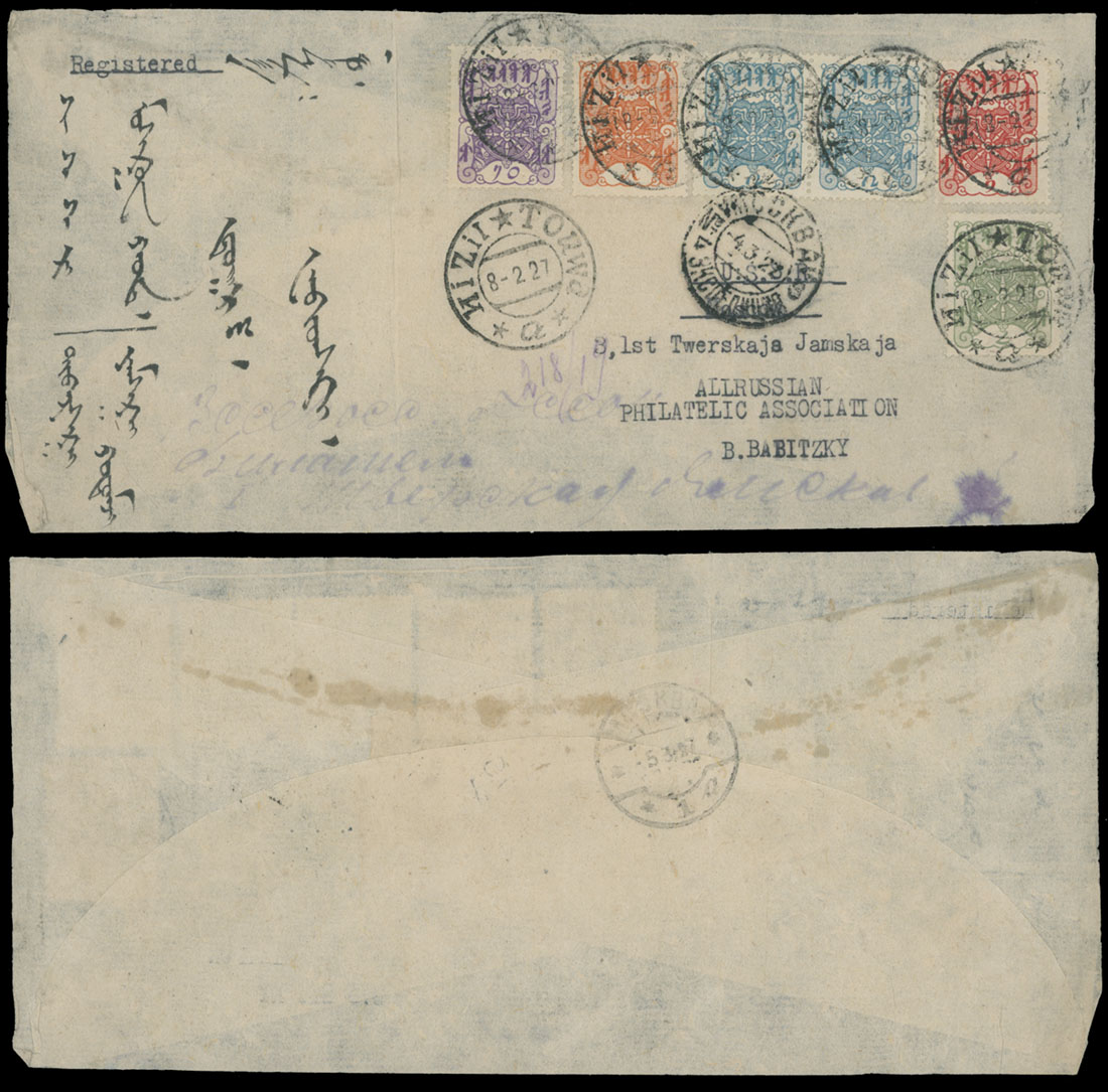 1927 (February 8), large size native paper registered cover from Tannu Tuva to Moscow, franked by six Wheel of Eternity stamps, met altogether 28 kop postal rate, tied by Kyzyl postal cancellation (Ustinovsky No.0.1), Moscow ”5.3.27” arrival marking, light usual fold did not detract, VF and rare, Est. $600-$800, Scott #1-5