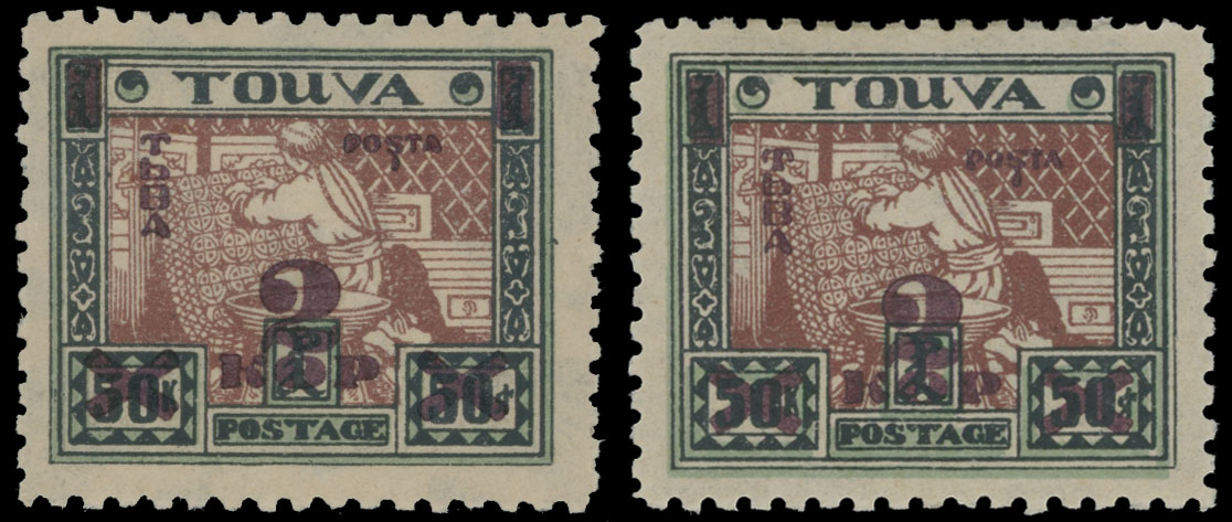 1932, Roman Alphabet, brown surcharge 2k on 50k black, green and red brown, two singles perforation L10x10½ (scarce) and L10, full OG, previously hinged, VF, Est. $120-$150 , Scott #30, b