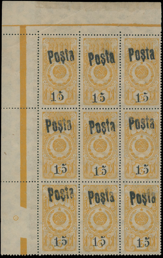 1933, black handstamped surcharge (small figures) 15k on Tuvan revenue stamp of 6k yellow, Soviet official reprint, top left corner sheet margin block of nine (3×3), control lines on the edges, full OG, NH, VF and rare multiple, Est. $1,500-$1,800, Scott #41 var
