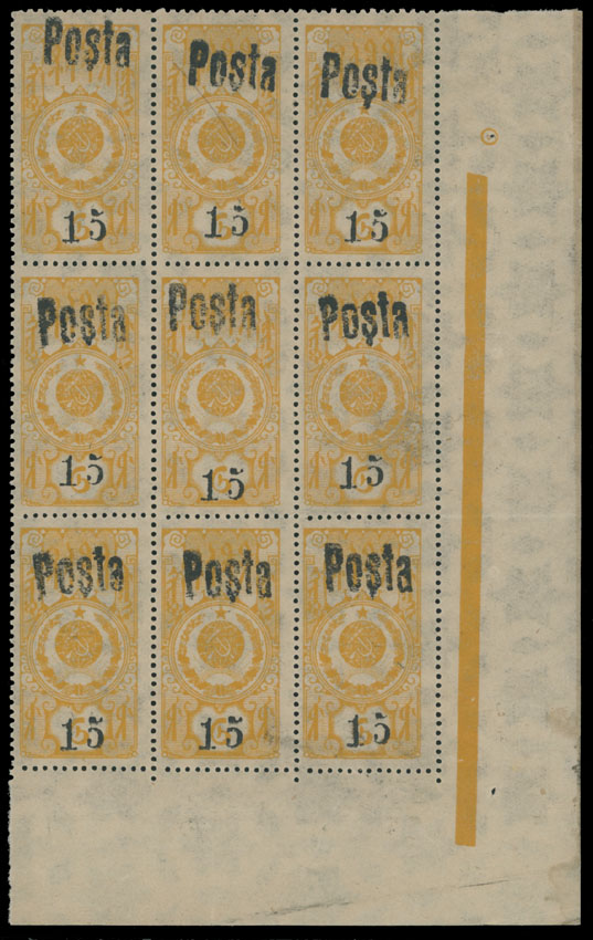 1933, black handstamped surcharge (small figures) 15k on Tuvan revenue stamp of 6k yellow, Soviet official reprint, bottom right corner sheet margin block of nine (3×3), middle stamp of the first horizontal row without a ”comma” variety, control lines on the edges, full OG, NH, VF and rare multiple, Est. $1,500-$1,800, Scott #41 var