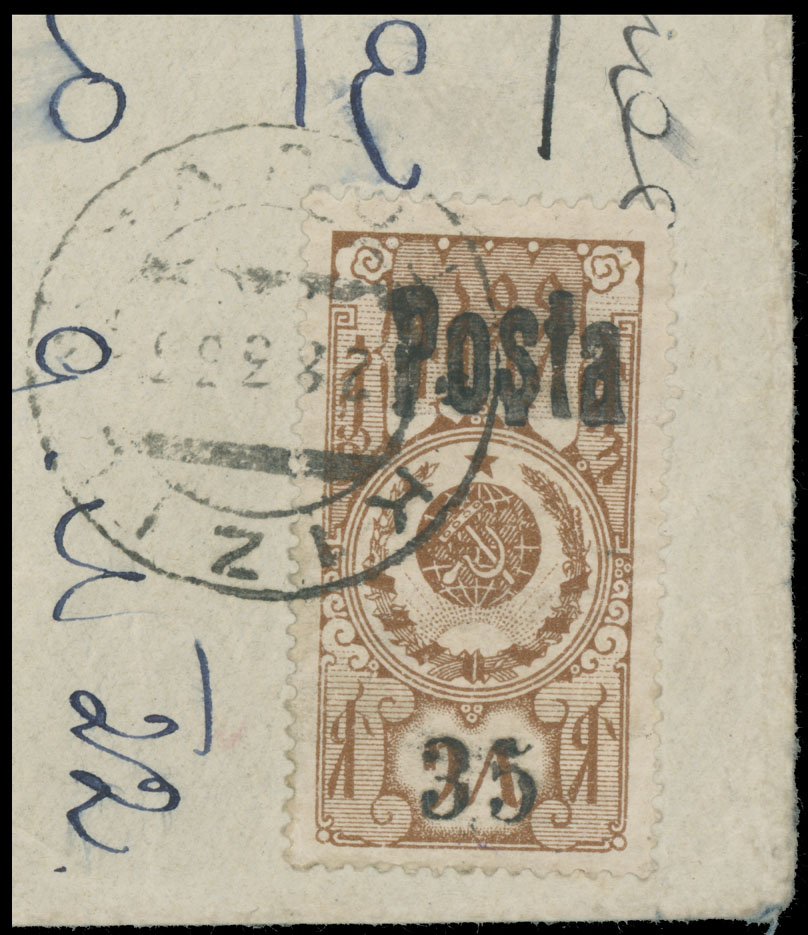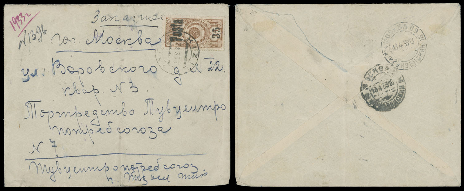 1933 (March 28-April 13), black handstamp (small figures – 5.1mm, type III) 35 (k) on 15k brown, used on registered cover to Moscow, tied by Kyzyl ”28.3.33” date stamp, two arrival markings on reverse, roughly opened, vertical fold away from the stamp, F/VF and extremely rare real commercial cover, Est. $3,000-$3,500, Scott #44