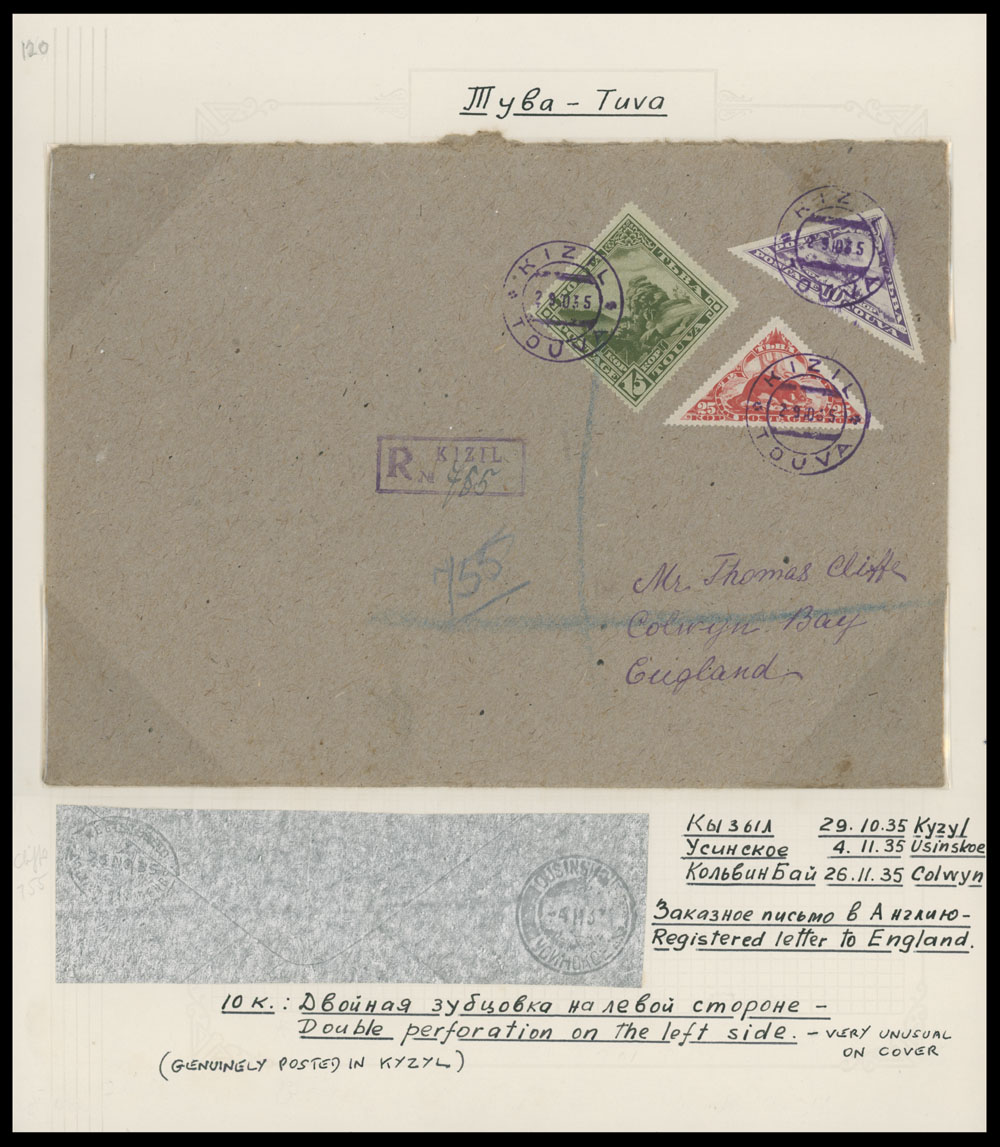 1935 (October 29), Pictorial issue triangle 10k with ”diamond” (double) perforation at left and 15k, Otter 25k, three stamps used on large size registered cover from Kyzyl to United Kingdom, Usinskoye ”4.11.35” transit and Colwyn Bay ”26.11.35” oval arrival marking, blue crayon lines as always, arranged on original page from the A. Cronin Collection, mostly VF, Est. $400-$500, Scott #57-58, 65