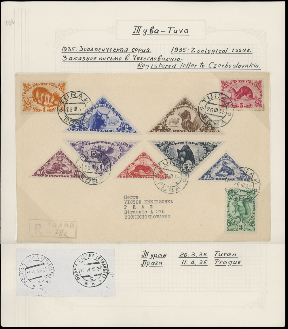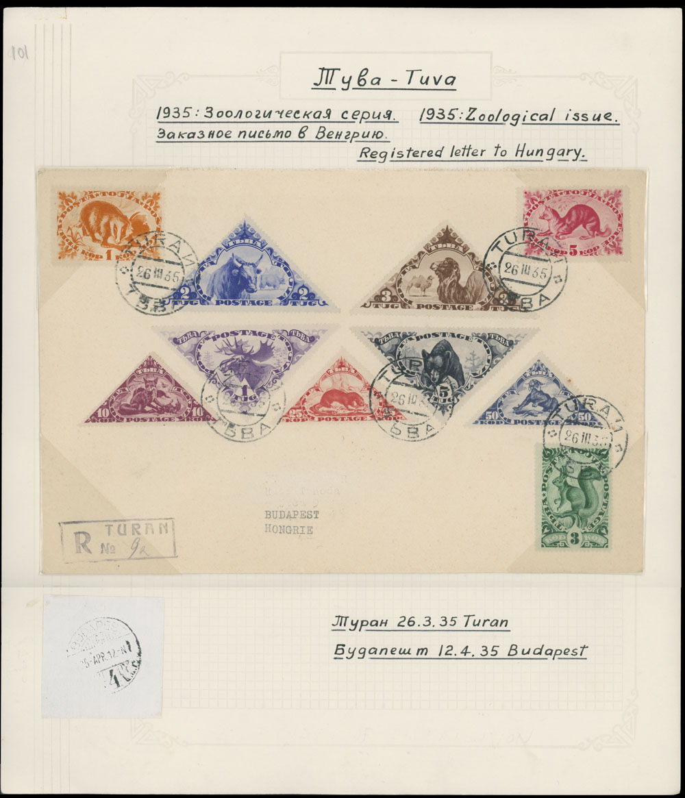 1935 (March 26), ”Zoological” issue 1k-5t, two complete sets of ten, used on two registered covers from Turan, uncommonly addressed to Prague and Budapest (address is partly erased), appropriate arrival date stamps of ”11.IV.35” and ”1935.APR.12” respectively, mostly VF, both arranged on pages from the A. Cronin Collection, Est. $300-$400, Scott #61-70
