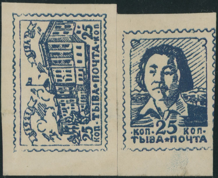 1942, 21st Anniversary of the Republic, Government House and Tuvan Woman, 25k blue, re-joined se-tenant pair, right stamp with narrow margin at right, still full original yellow brown gum, hinge from re-enforcement, generally VF and extremely rare, ex-A. Cronin, C.v. $1,900 as two singles, Est. $2,000-$2,500, Scott #117, 119