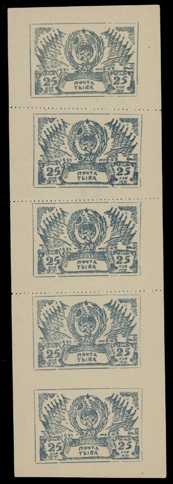 1943, Coat of Arms, 25k slate blue, complete sheet of five printed on white paper, bottom pair is imperforate between stamps, no gum as issued, NH, VF and very rare, Est. $1,200-$1,500 , Scott #120ab