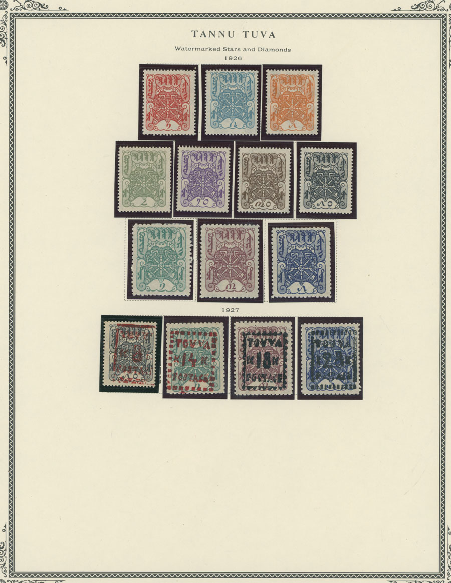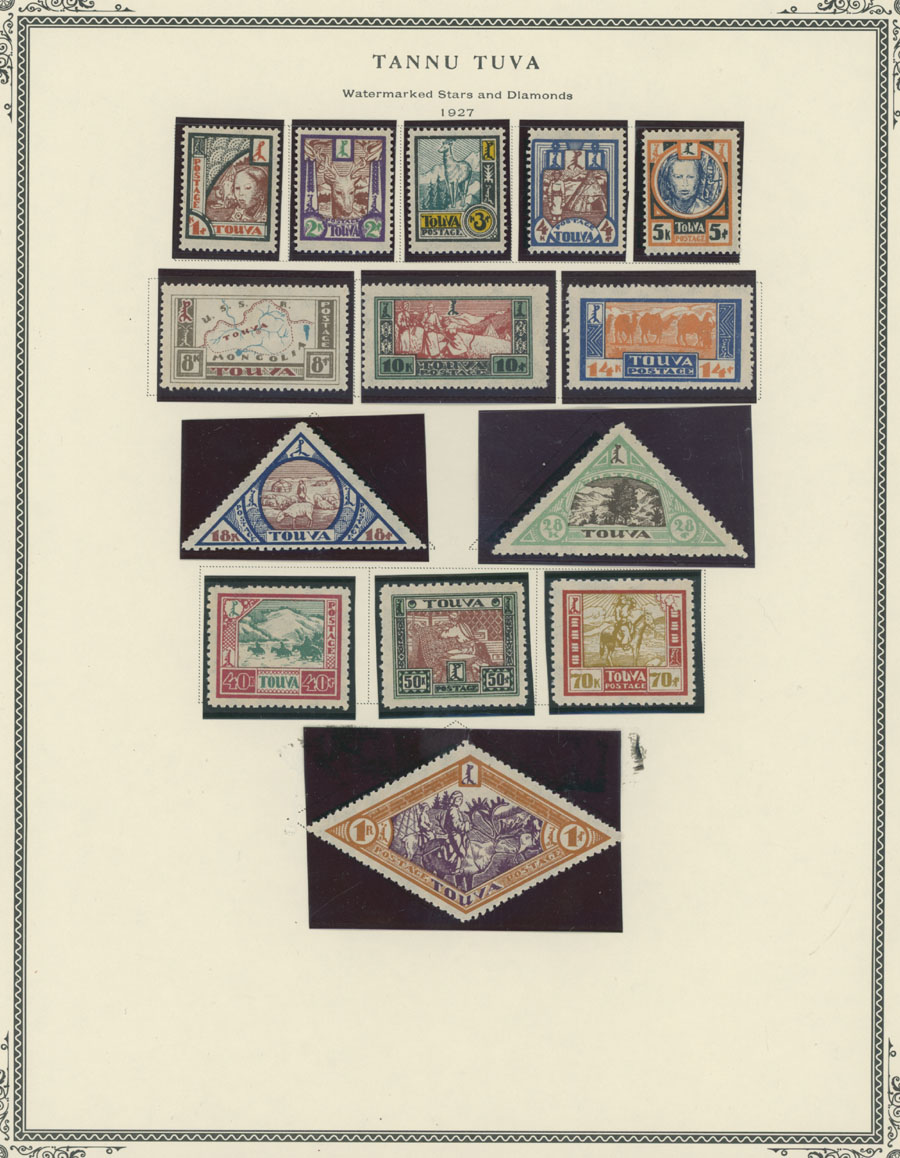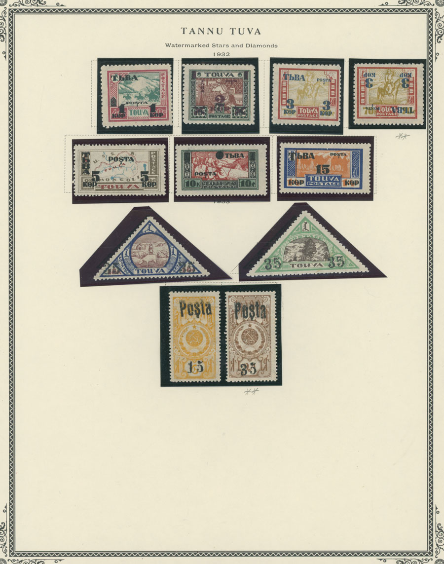 1926-35, 59 mint stamps representing seven complete issues, including Wheel of Truth issue and later surcharged set, Pictorial issue plus Roman Alphabet overprint/surcharges, including never hinged No.31a, 15k and 35k surcharges on revenue stamps (35k/15k – NH), Wild Animal issue and the first Air Post set with small and large sizes of 2t (both sets are NH), nice and clean unit, full OG, NH or LH/hinged, F/VF, C.v. close to $3,500, Est. $1,200-$1,500, Scott #1/70, C1‑9, var