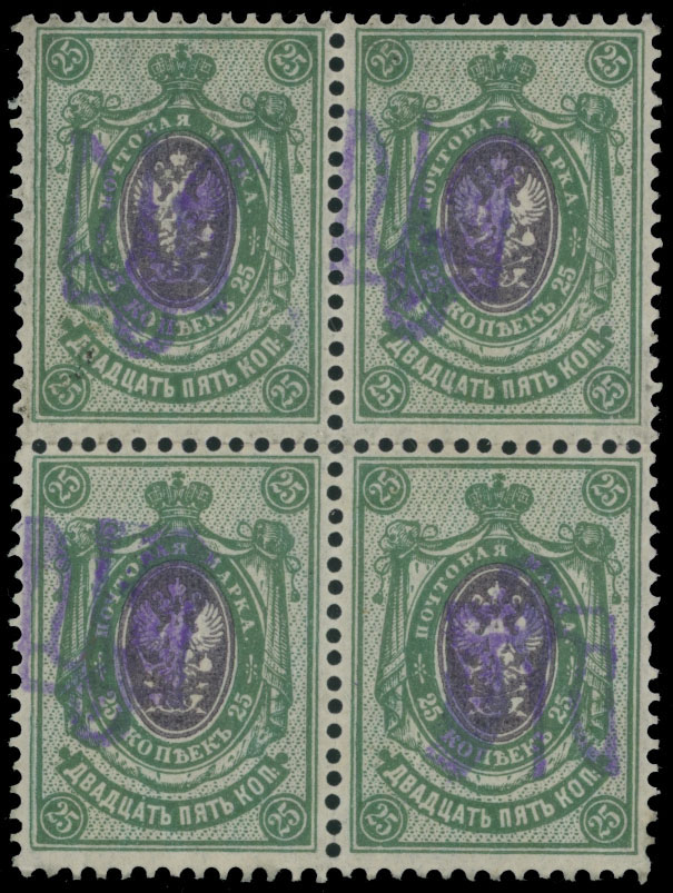 1918, violet overprint (type 2a) on 25k green and violet, block of four, bottom right stamp with inverted overprint, full OG, NH, VF and rare multiple, each stamp expertized by J. Bulat, C.v. $500 as four stamps with common upright overprint, Est. $300-$400, Bulat #271, var