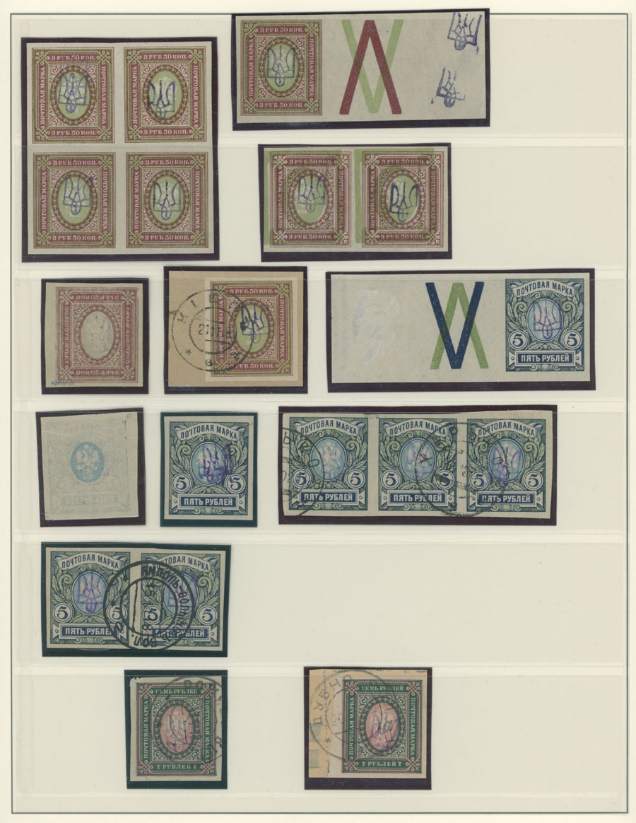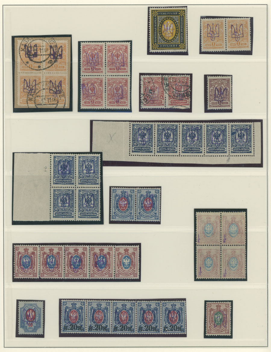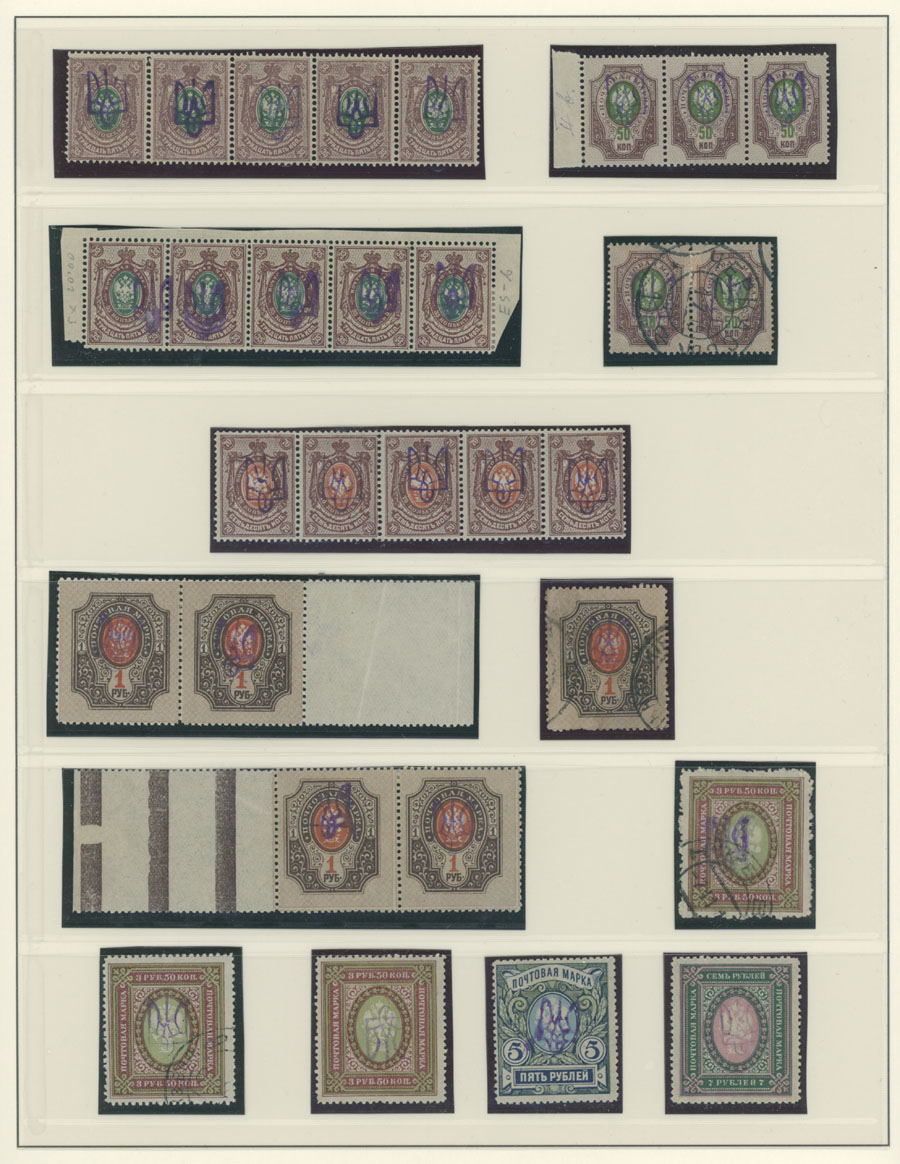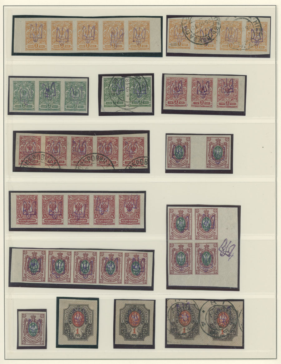 NICE COLLECTION OF TYPES 2B AND 2BB ON LINDNER PAGES: 1918, violet overprints on 133 perforated and imperforate stamps of 1k-7r, including 32 postally used values, singles, horizontal pairs and strips of three, four or five, se-tenant with and without overprint on strip of 15k, inverted or double overprints, overprint on margin, used high values and etc., well quality, full OG or used, F/VF, Bulat #294/322, C.v. is over $1,650 (#303 priced with -‘-), Est.$800-$1,000, Bulat #294/ 322, var