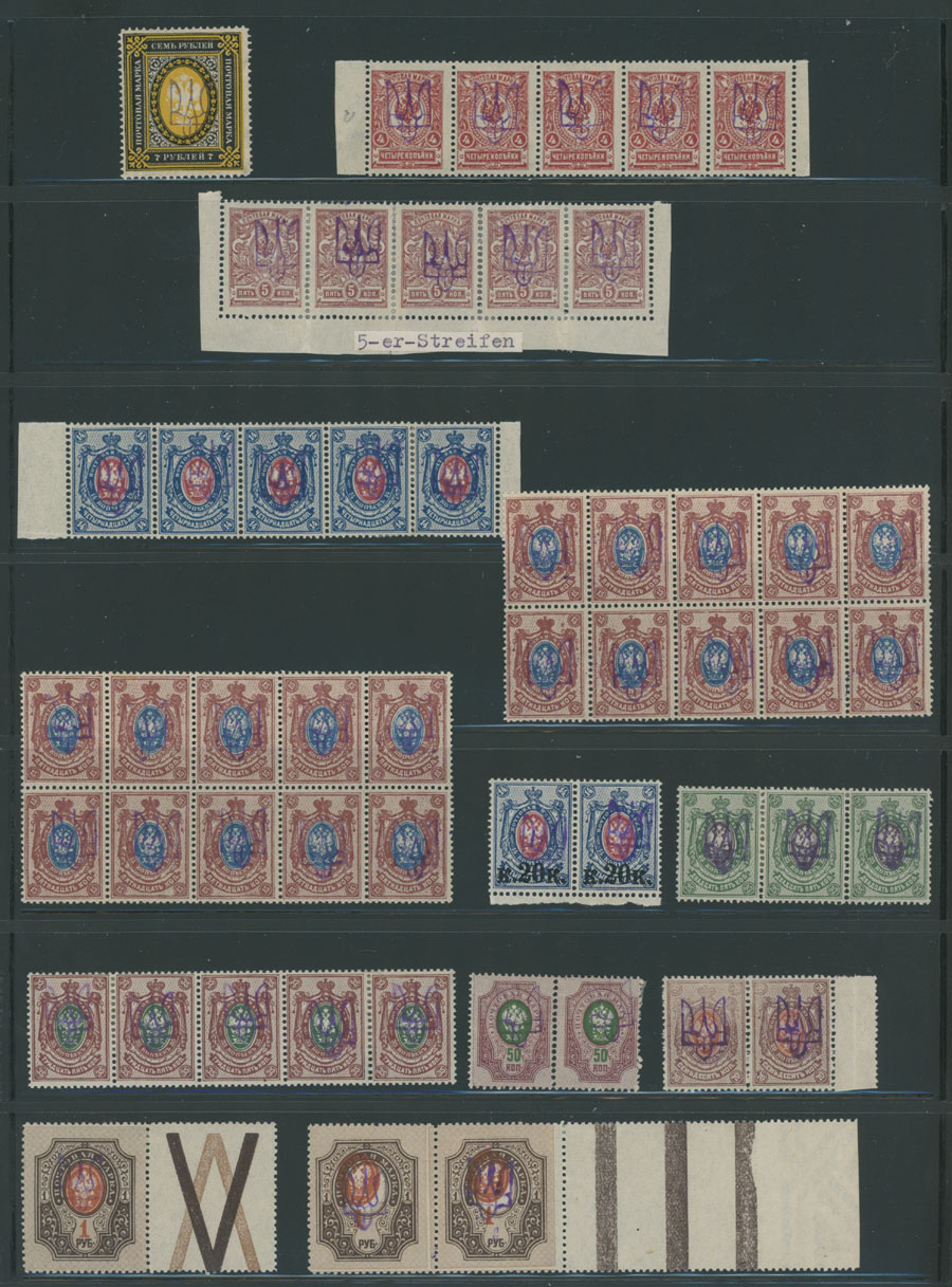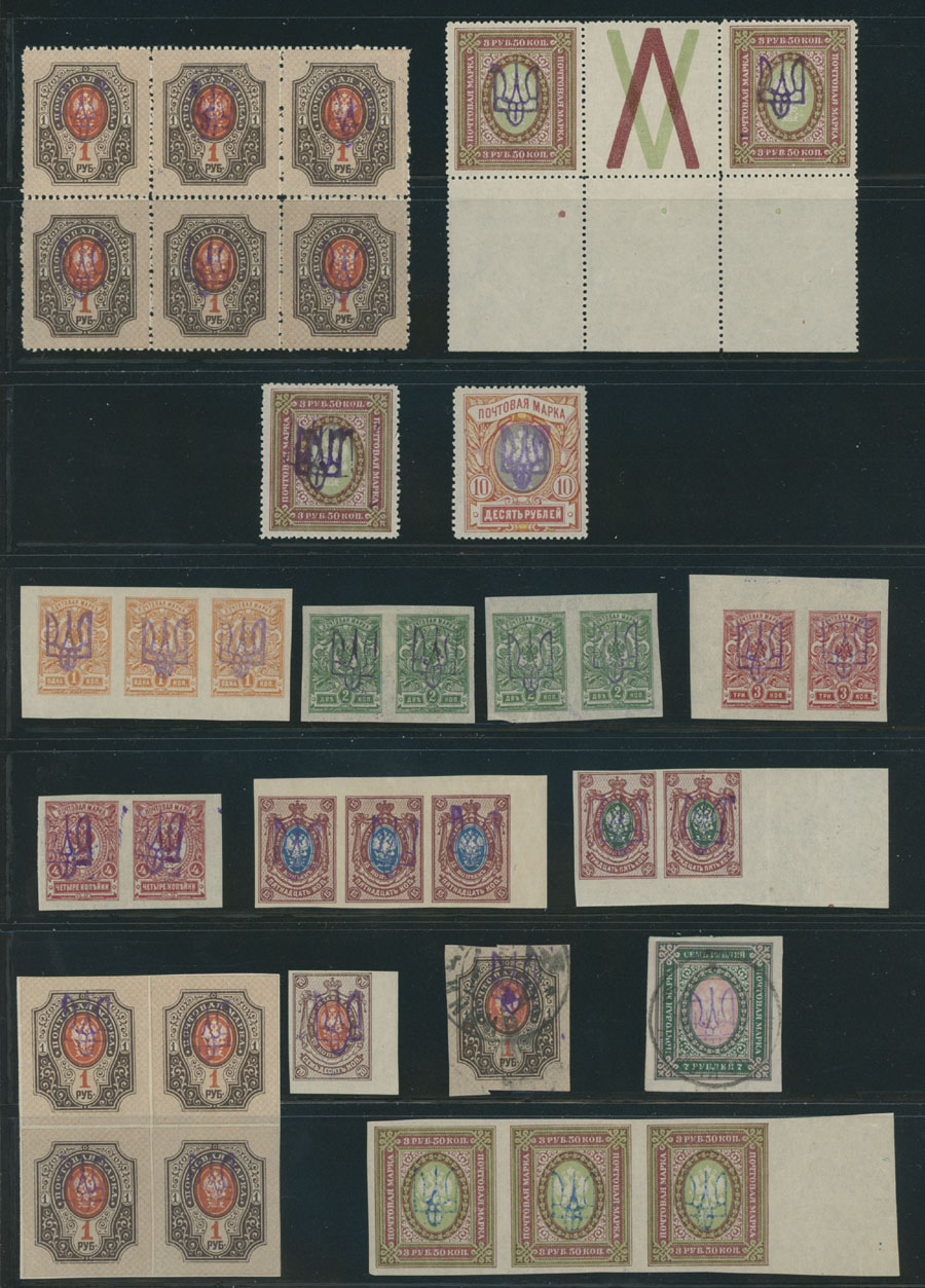 ASTONISHING COLLECTION OF MAINLY MULTIPLES OF TYPE 2C: 1918, 89 mostly mint perforated and imperforate stamps (2 – used), 7 singles, others are in pairs, strips of three, four or five, blocks of four, six or ten, including a single of 7r on vertically laid paper, perf 5k in strip of five, 20k/14k in pair, imperf 3.50r in strip of three with blue overprint and more, full OG, NH, LH/hinged or used, F/VF, ex-Dr. Seichter, Dr. Zelonka and others, C.v. is over $3,400, Est. $1,500-$1,800, Bulat #323/49