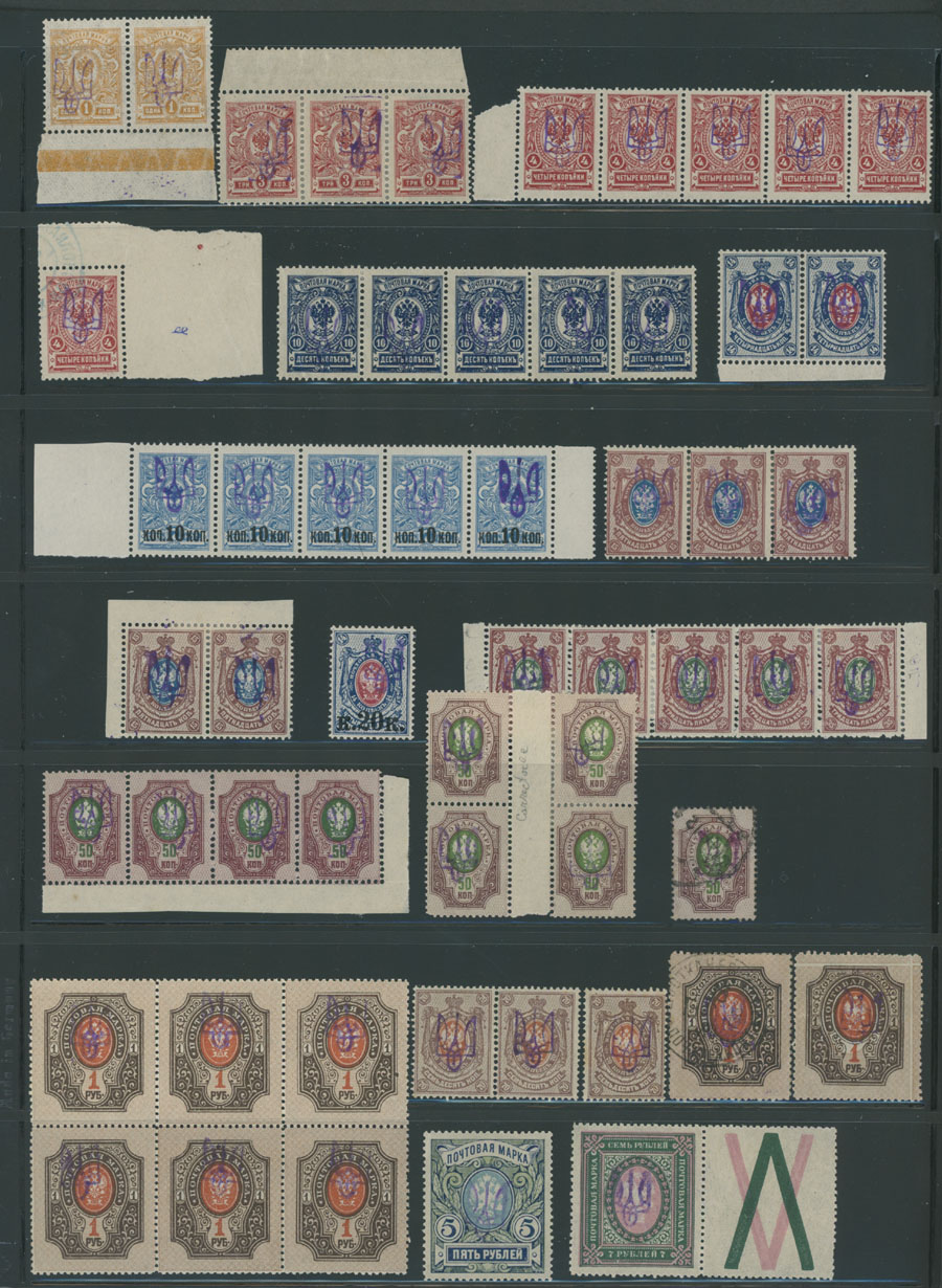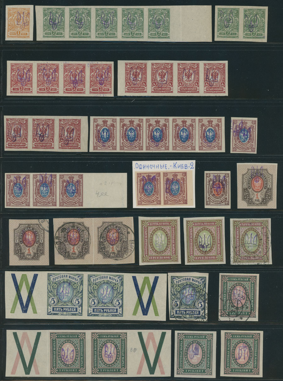 CLEAN COLLECTION OF TYPE 2EE: 1918, over 100 mostly mint stamps (2 – used) in perforated and imperforated singles, pairs, strips and blocks, among better perforated single and pair of 70k, a single of 5r, imperforated 70k (No.403, priced with -‘- in the Cat.), fresh quality, full OG, NH, LH/hinged or used, F/VF, ex-Dr. Seichter, Dr. Zelonka and others, C.v. $1,300++, Est. $500-$600, Bulat #381/ 407a