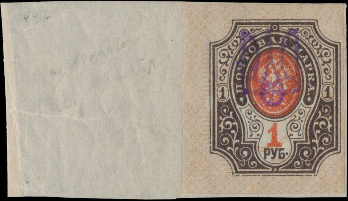 1918, violet overprint (type 2f) on imperforate 1r brown, pale brown and orange, left sheet margin single with inverted background, full OG, NH, VF and scarce, not mentioned in the catalog, expertized by Dr. Seichter, Est. $150-$180 , Bulat #438 var