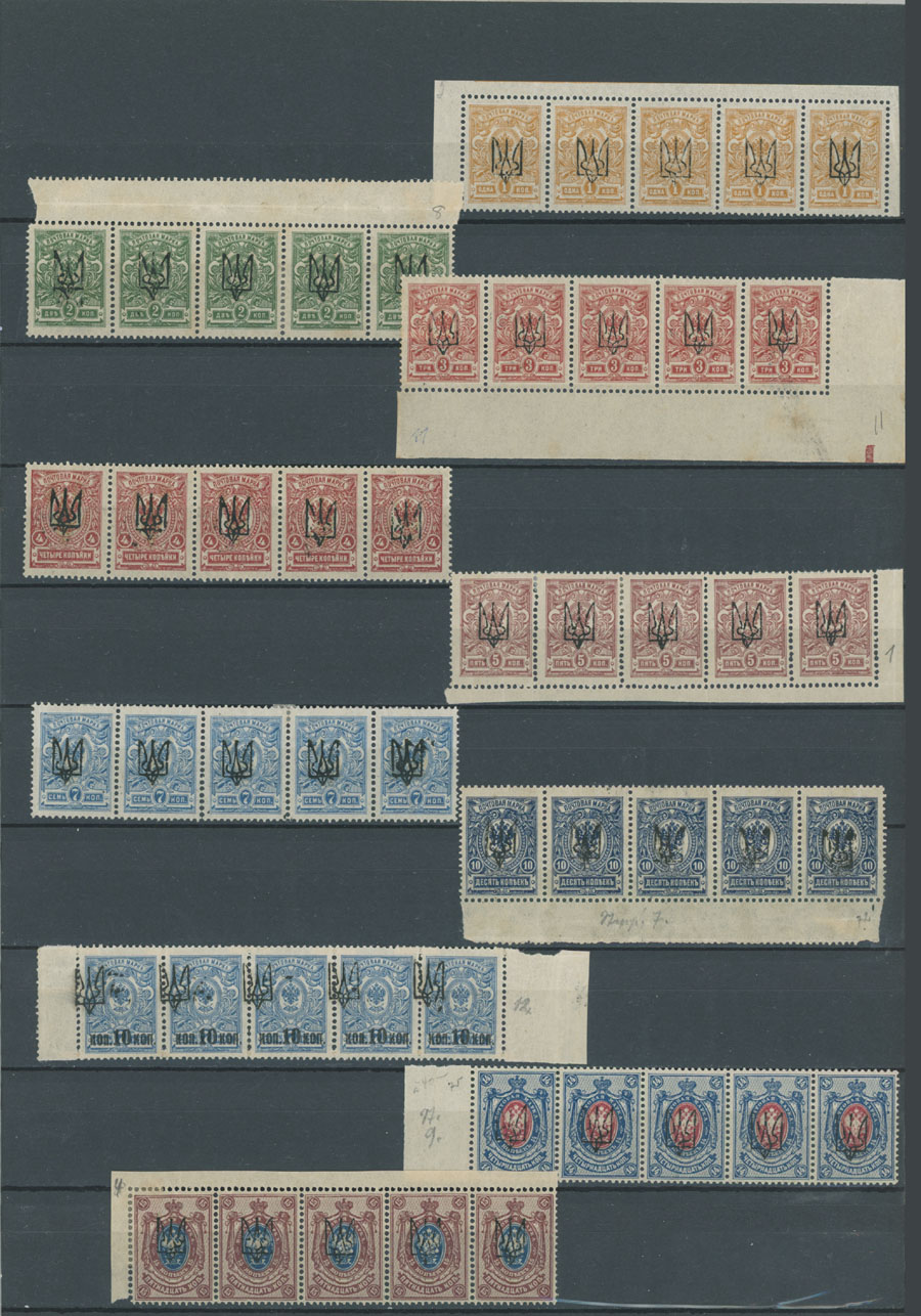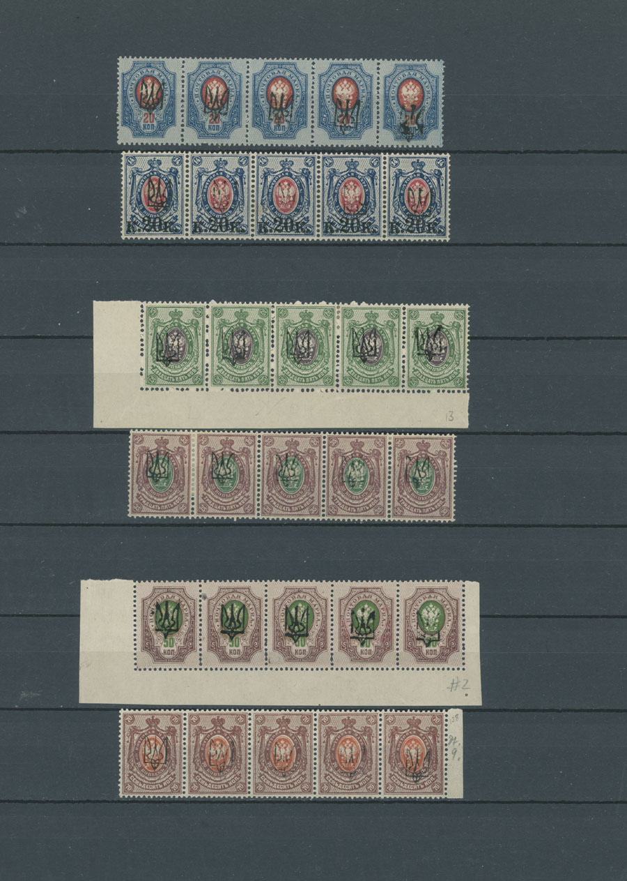 1918, black overprints (Type 1 Multiple Handstamp) on perforated 1k-70k, complete set of 16 in strips of five, full OG, NH or LH/hinged, F/VF, ex-Dr. Seichter, Dr. Zelonka and others, C.v. $728 as single stamps, Est. $500-$600 , Bulat #661-76