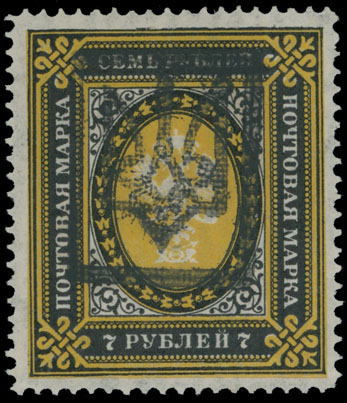 1918, black boxed overprint (type 2) on 7r black and yellow, printed on vertically laid paper, full OG, previously hinged, VF, expertized by Dr. Seichter and others, C.v. $150, Est. $120-$150 , Bulat #856