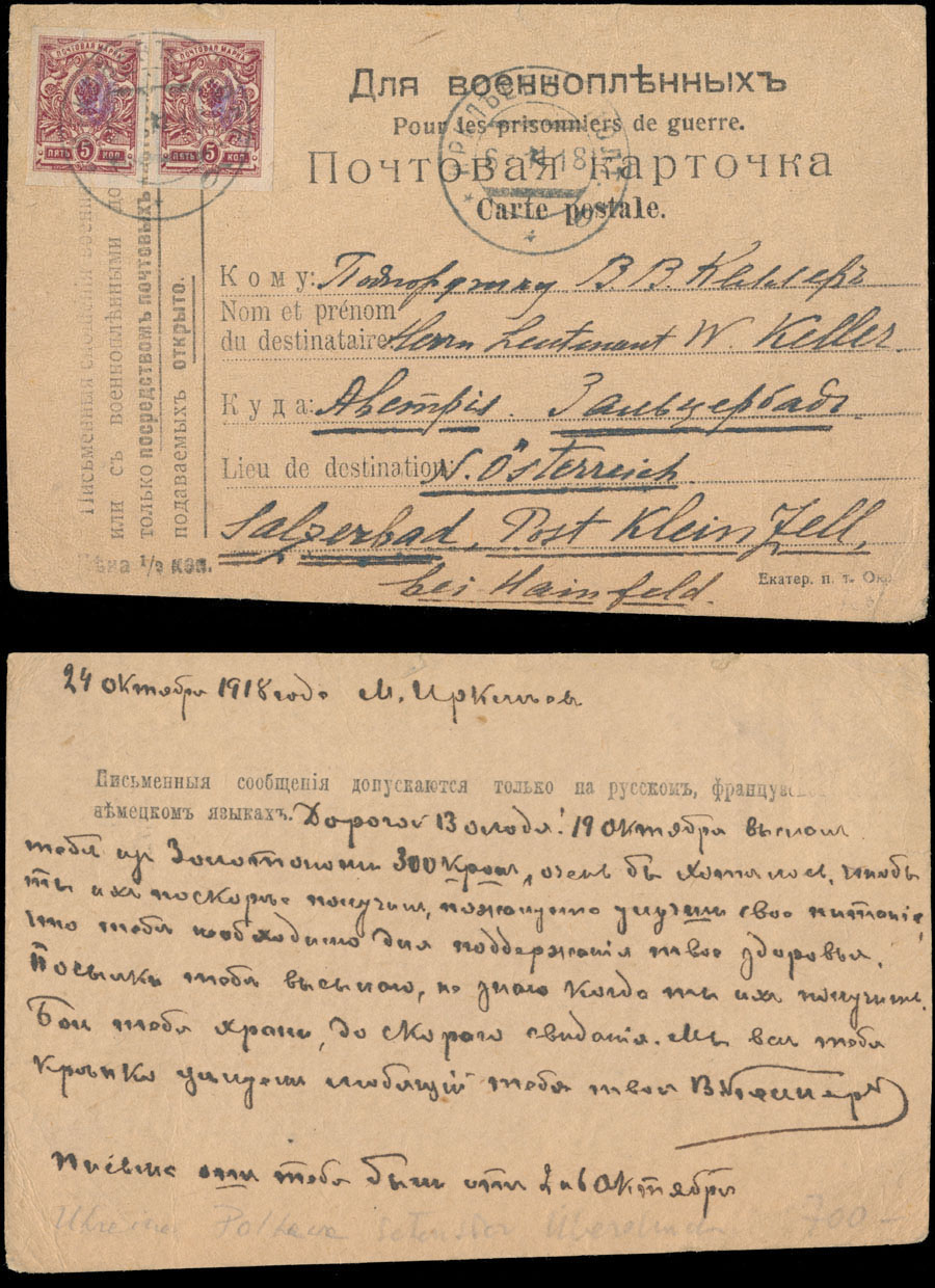 1918, violet overprint (type 1) on 5k claret, two imperforate singles used on POW card from Irkliiv to Austria, mostly fresh and VF, C.v. $450 as used stamps off card, Est. $300-$400 , Bulat #966