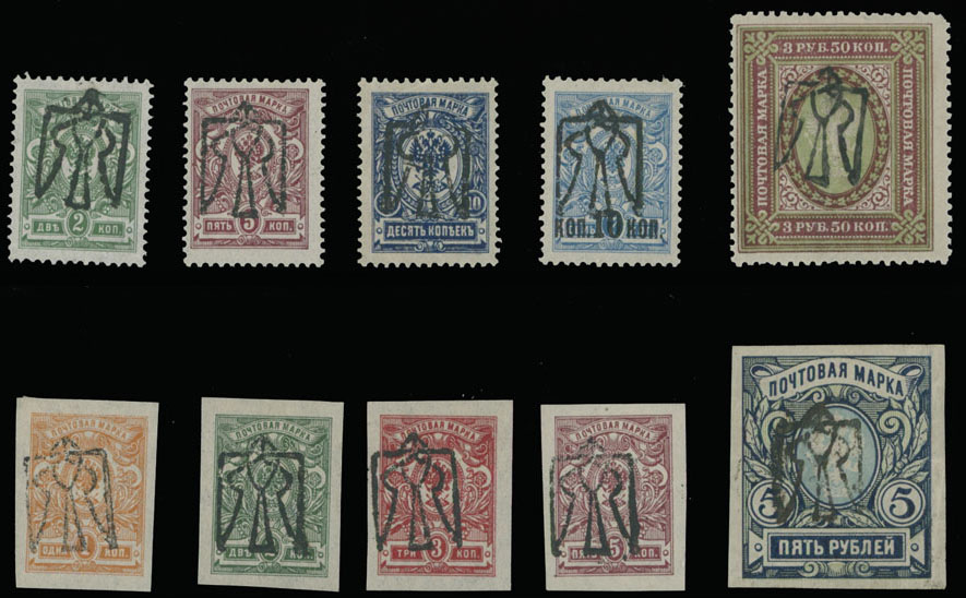 1918, black inverted overprint (type 6) on perforated 2k, 5k, 10k, 10k/7k and 3.50r, imperforate 1k, 2k, 3k, 5k and 5r, full/large part of OG, VF and rare assembly, each stamp with experts’ guarantees, most inverts not listed in the Cat., Est. $300-$400, Bulat #1225a/55 var