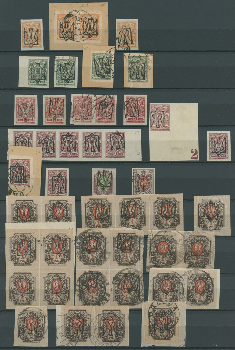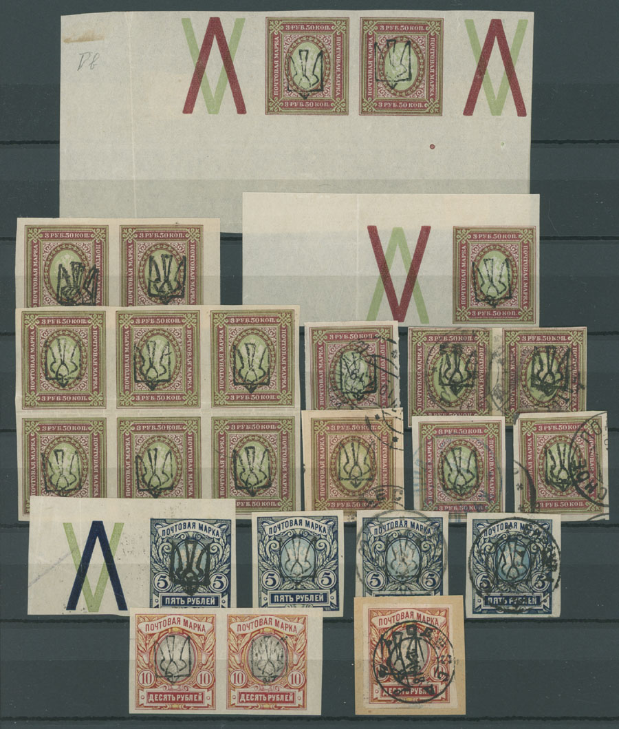 REMARKABLE SELECTION OF IMPERFORATE STAMPS OF TYPE 6: 1918, 70 mint and used (30) stamps, including 17 inverted overprints, rare mint 50k, inverted overprint on 70k (not priced unused), scarce 5r and 10r, each one presented in two mint and one or two used stamps, clean unit, full/large part of OG or used, F/VF, ex-Dr. Zelonka, C.v. is over $1,350, Est. $500-$600, Bulat #1244/57