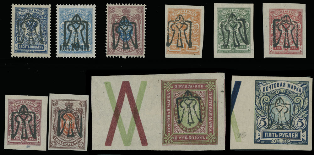 1918, inverted black overprints (type 8) on perforated 10k, 10k/7k and 15k, imperforate 1k-5r, the total is ten values, full OG, mainly LH, VF, all are properly expertized, C.v. $430, plus imperf 5k and 70k not listed in the Cat. with inverted overprints, Est. $300-$350, Bulat #1285a/ 306a