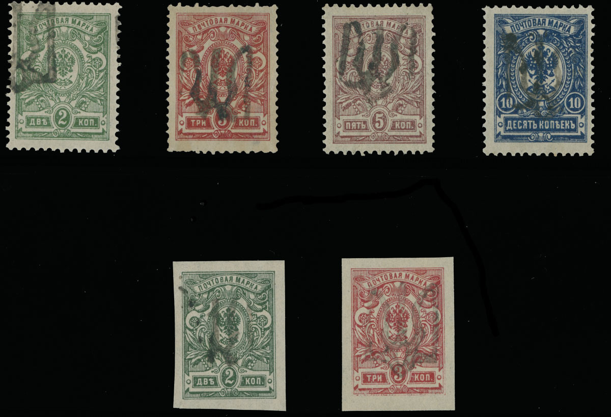 1918, black overprint (type 29) on perforated 2k, 3k, 5k and 10k, imperforate 2k and 3k, full OG, NH, LH or hinged, VF and scarce group, most with expert’s hs on reverse, ex-Dr. Zelonka, C.v. $175, while perforated 3k and 5kpriced with ”-” in the Cat., Est. $400-$450, Bulat #1844/48, 1854-55
