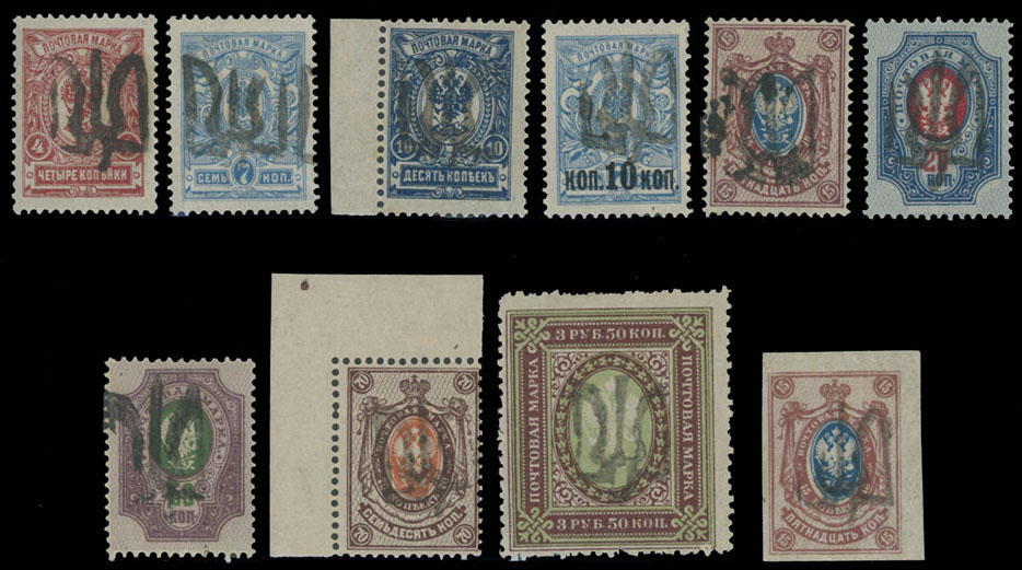 1918, black overprints (type 33) on perforated 4k-3.50r and imperforate 15k, full/large part of OG, mostly VF, ”key” values expertized by J. Bulat, Dr. Seichter and U.P.V., ex-Dr. Zelonka, C.v. $447, Est. $250-$300 , Bulat #1876/92
