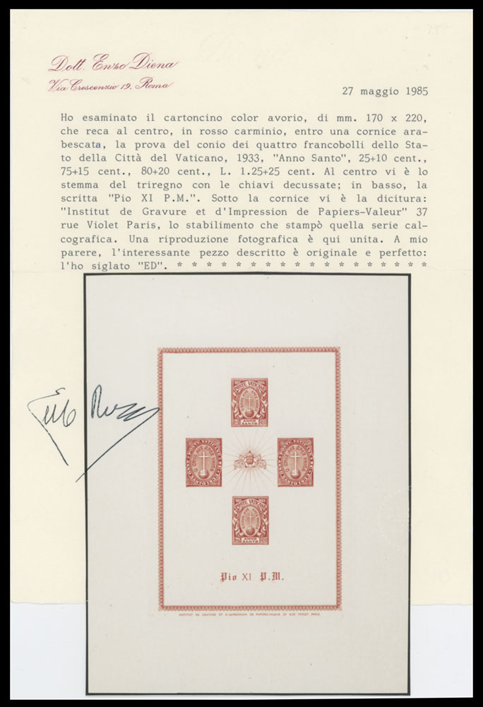 1933, Holy Year issue, 25c+10c – 1.25L+25c, composite die proof in carmine, printed on thick white card, size 170x222mm, ”Institut de Gravure et D’Impression de Papiers-Valuer…” imprint at the bottom, fresh, VF and extremely rare, only a few are known, Sassone #15-18, Est. $3,000-$4,000, Scott #B1-4