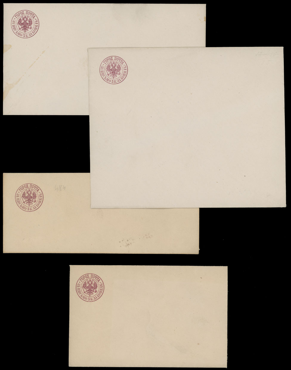 1869, 5+1k red lilac, four unused envelopes of all existing sizes 145x80mm, 140x110mm, 140x60mm and 115x83mm, fresh quality, last two with slightly toned paper as usual, still VF, Standard Cat. #SCC11, C.v. $450, Est. $200-$250