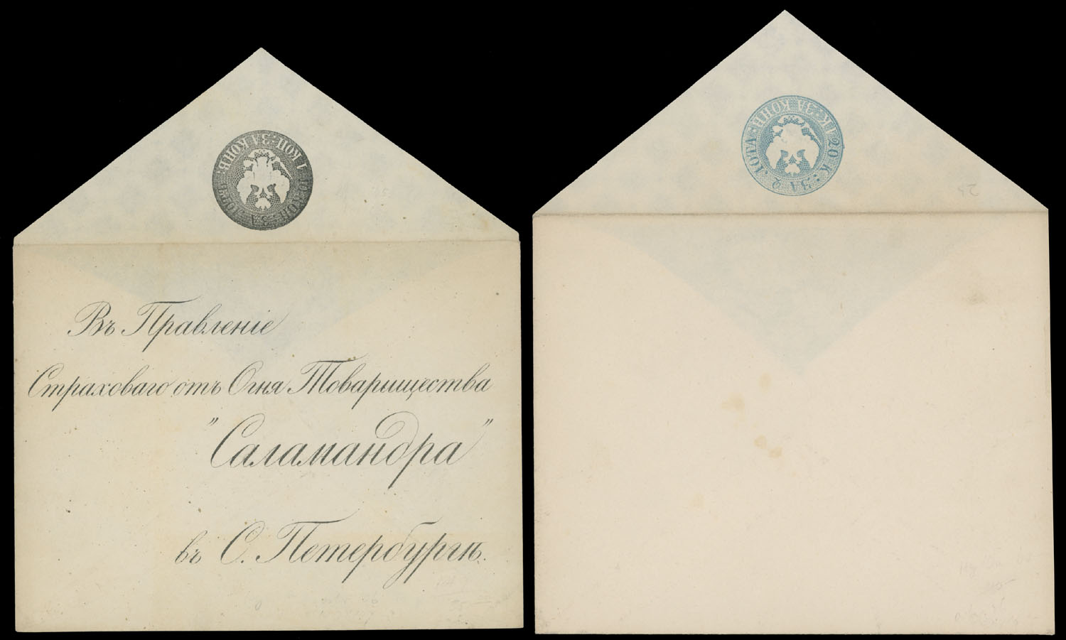 1848, 20+1k light blue, first issue printed on yellowish rough paper, Eagle with wide tail, size 143x116mm, in addition 10+1k gray black ”Salamandra” envelope from the fourth issue, Eagle with narrow tail, size 140x108mm, both have watermark I, cutting type III, unused, mostly VF, Standard Cat.#SC2, SC7, C.v. $450, Est. $250-$300