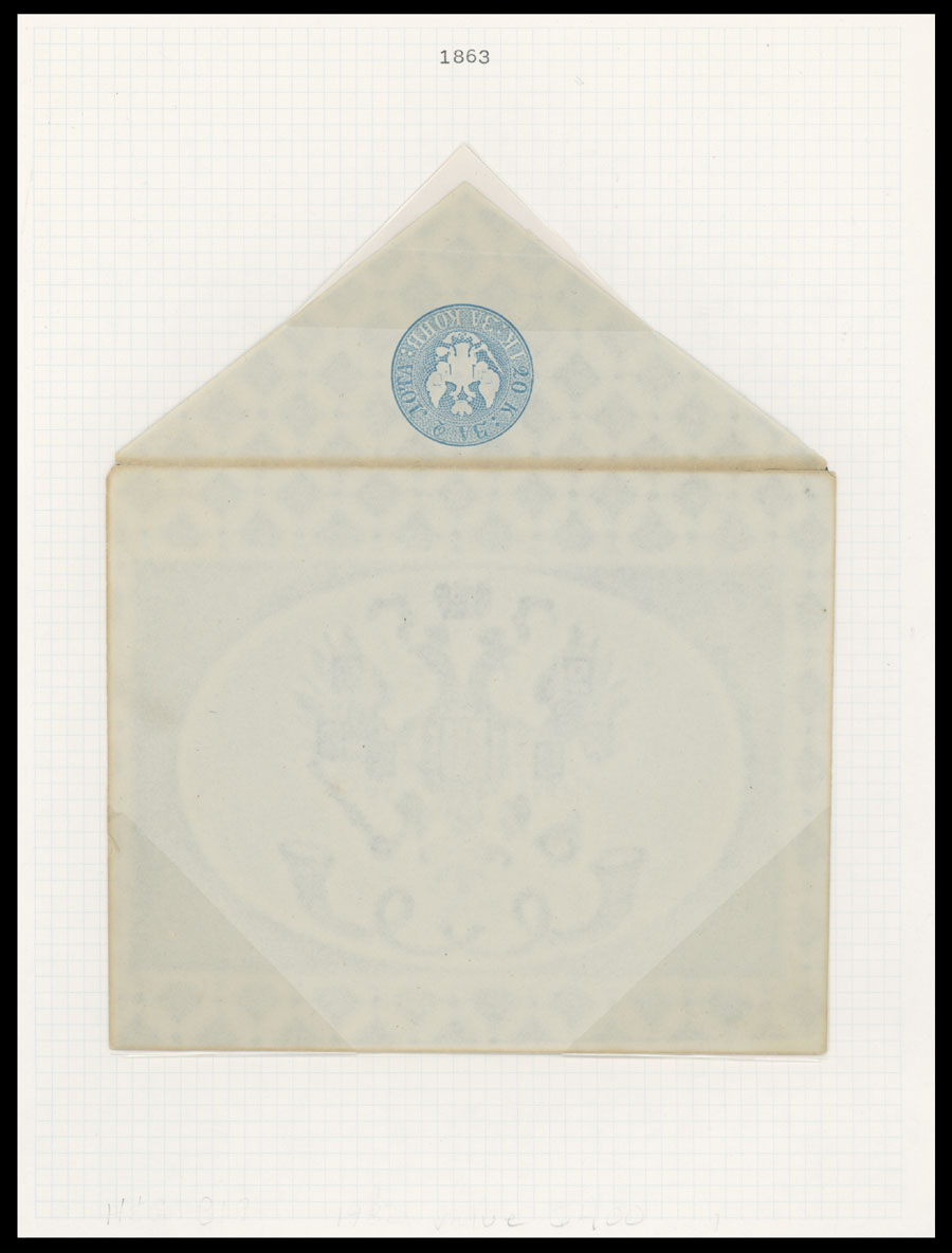 1863, 20+1k light blue, 7th issue printed on slightly bluish hard paper, Eagle with narrow tail, size 142x115mm, watermark III, cutting type III, unused, flap re-enforced, still F/VF and rare, ex-Faberge, Standard Cat. #SC16, C.v.$2,000, Est. $600-$800