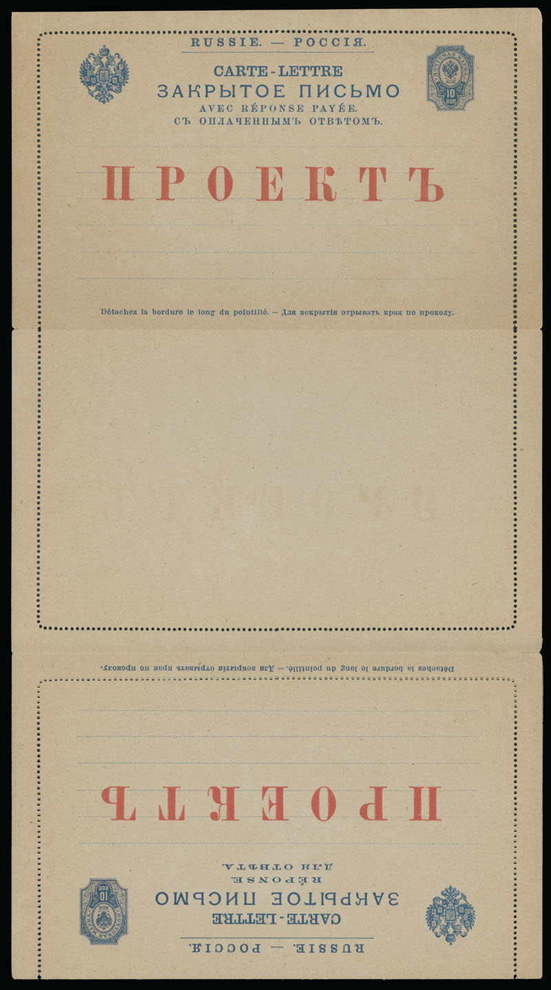 1896, reply letter card essay of 10k+10k blue, contains two unsevered letter cards (reply portion closed), each part with red overprint ”PROEKT”, insignificant perf separation at right, still fresh, VF and very rare, Standard Cat. #ES6 A, Est. $1,000-$1,200