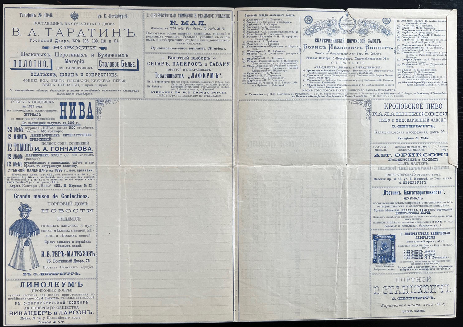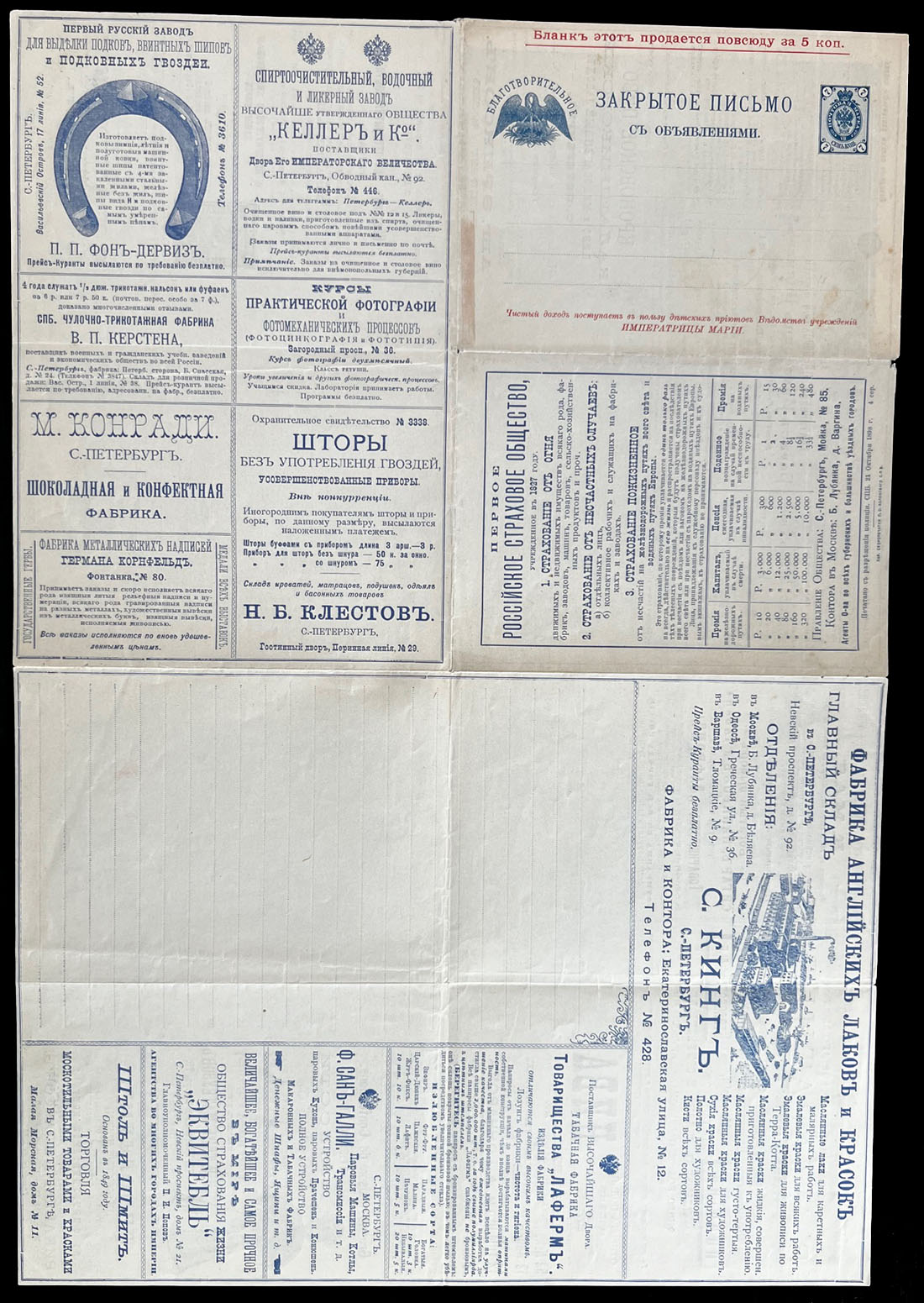 1898, 7k blue, unused letter-sheet of series 4, printed in St. Petersburg, containing 24 various advertisements inside and on reverse, usual folds, mostly VF, Est. $600- $700